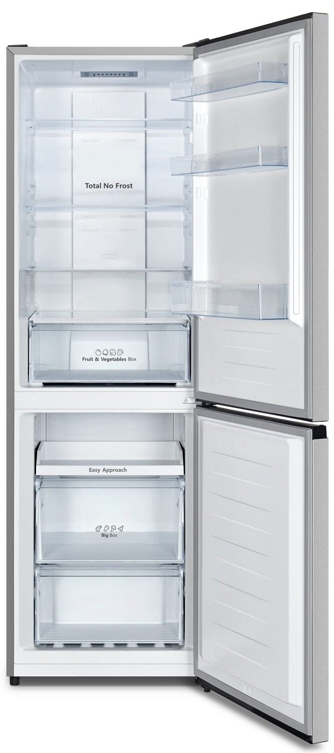 Оборудование Hisense оснащено нижним морозильником на 93 л с тремя вместительными полками. Холодильная камера вмещает 207 л и дополняется прочными стеклянными полками. Прибор оснащен внутренним дисплеем с температурной индикацией, режимами «Отпуск» и «Суперзаморозка», LED-подсветкой и системой MultiAirFlow.