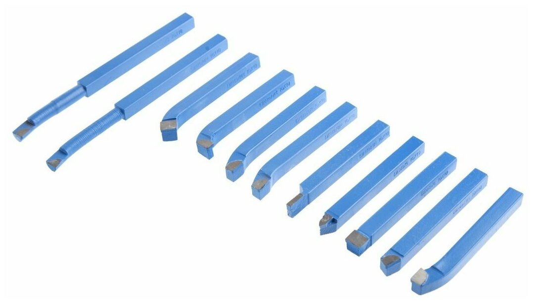 В комплект набора резцов для металлообрабатывающих станков (Энкор Корвет 401, Корвет 402, Корвет-403, Корвет 407) Набор токарных резцов по металлу Энкор 23362 представляет собой комплект оснастки из 11 шт. для выполнения основных токарных работ на оборудовании. Набор режущих инструментов предназначен для работы на металлообрабатывающих станах. Благодаря такому приспособлению, стало возможным существенно увеличить не только длительность срока эксплуатации резца, но и повысить качества токарной обработки. 4971R Токарный резец проходной прямой 4972 R Токарный резец проходной отогнутый правый 4973 R Токарный резец расточной проходной 4974 R Токарный резец расточной упорный 4975 Резец токарный резьбовой 4976 Резец токарный фасонный 4977 R Токарный резец подрезной (торцовый) 4978 R Токарный резец проходной упорный отогнутый правый 4980 R Токарный резец проходной упорный отогнутый правый 4980 L Токарный резец проходной упорный отогнутый левый 4981 R Резец токарный отрезной (канавочный) оттянутый влево Набор резцов для токарных станков с напаянной пластиной из твердого сплава, сечение 10 х 10 мм, количество резцов в наборе 11 штук.