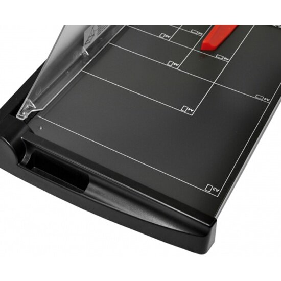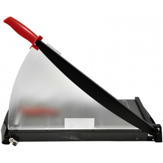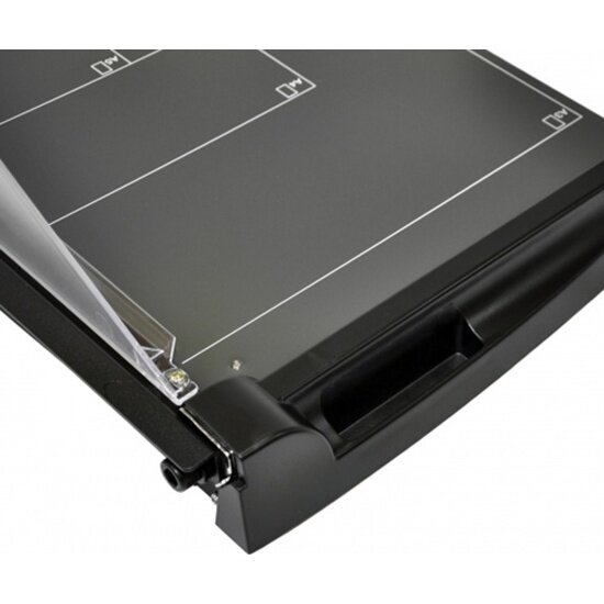 Покупкой довольны, резак очень понравился, классно смотрится и режет неплохо. Белые линии разметке хорошо выделяются на черном фоне рабочего стола, металлические прижим и направляющая упора, сам упор легко и надежно фиксируется защёлкой. Нож закрыт прозрачным экраном, его можно закрыть в нижнем положении.