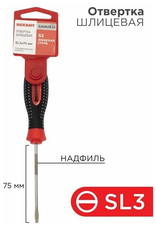 Отвертка шлицевая REXANT предназначена для проведения монтажных и демонтажных работ с резьбовыми соединениями: шурупами, саморезами и т. д. Стержень инструмента выполнен из качественной японской стали с намагниченным наконечником. Отвертка обладает эргономичной трехкомпонентной рукояткой, которая предотвращает скольжение и прокручивание инструмента в ладони и обеспечивает более комфортную работу. В основании инструмента предусмотрено отверстие для подвеса.