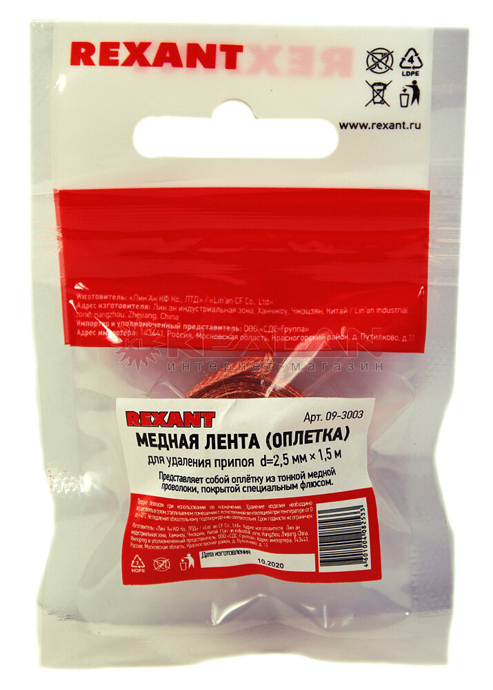Оплетка для удаления припоя предназначена для деликатного демонтажа радиокомпонентов с печатных плат при ремонтных работах. Представляет собой оплётку из высококачественной тонкой медной проволоки, покрытой безотмывочным флюсом «RMA».