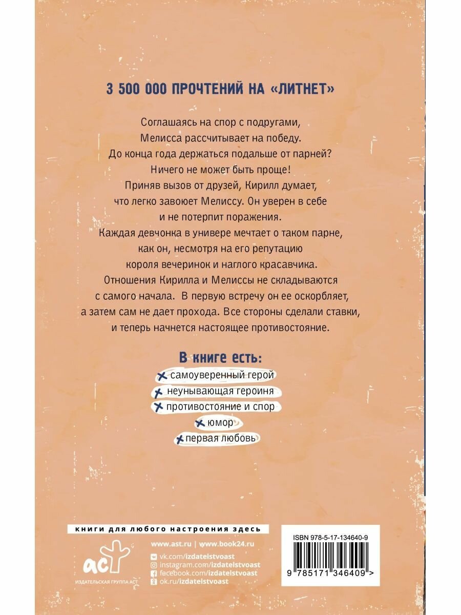 Приняв вызов от друзей, Кирилл думает, что легко завоюет Мелиссу. Он уверен в себе и не потерпит поражения. Каждая девчонка в универе мечтает о таком парне, как он, несмотря на его репутацию короля вечеринок и наглого красавчика.