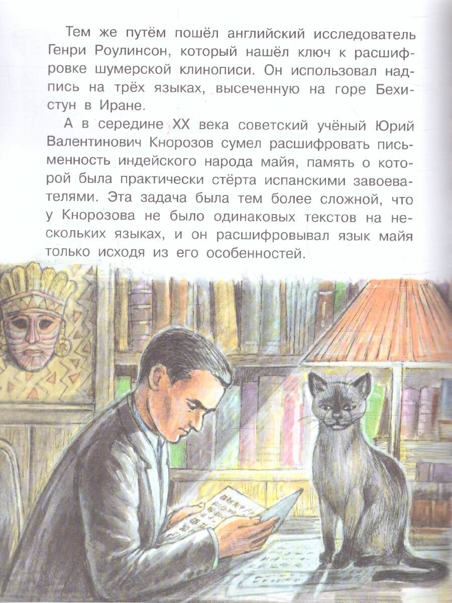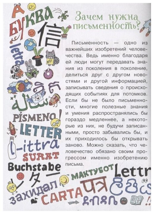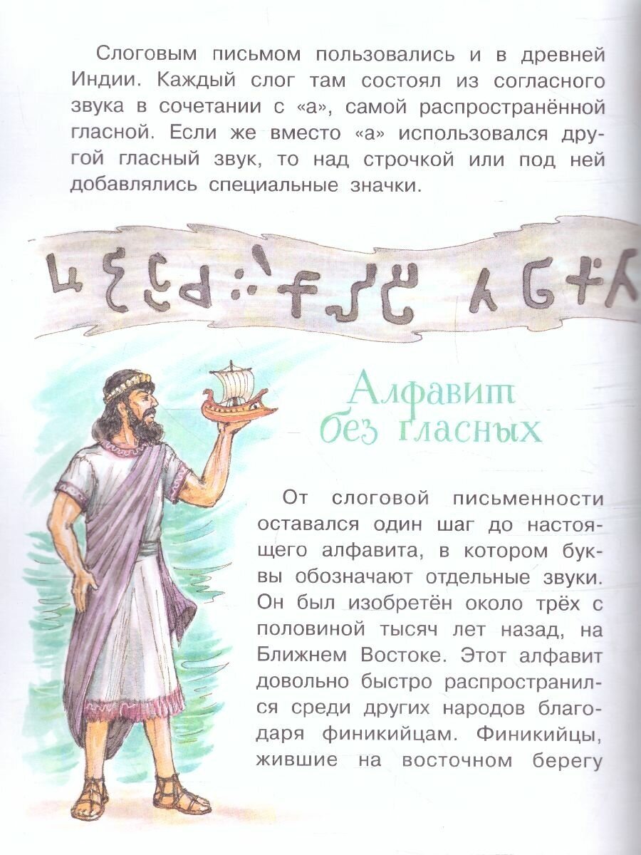 Книга содержит интересную информацию о том, как возникла азбука. Написано просто и доступно. Например, такие понятия как пиктограмма и идеограмма не только объяснены, но и нарисованы примеры. Кстати, в книге, примеров достаточно. Читать удобно, в книге крупный шрифт и яркие иллюстрации, поэтому книга предназначена детям начальной школы. Жаль, что нет содержания.