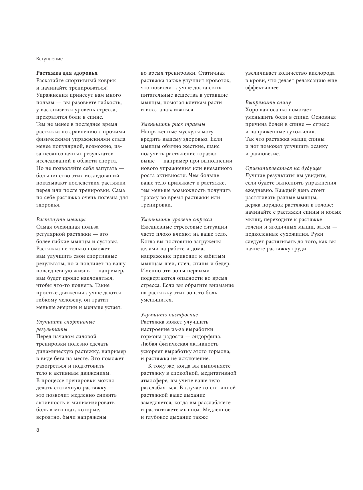 Книга уделяет внимание всем частям тела и является самым обширным и универсальным сборником упражнений на растяжку, которые можно делать в любом месте и в любую минуту.