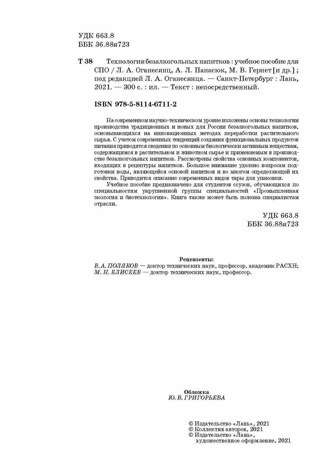 Технология безалкогольных напитков.Уч.пос.СПО (Оганесянц Лев Арсеньевич, Панасюк Александр Львович, Гернет Марина Васильевна); Лань, 2021