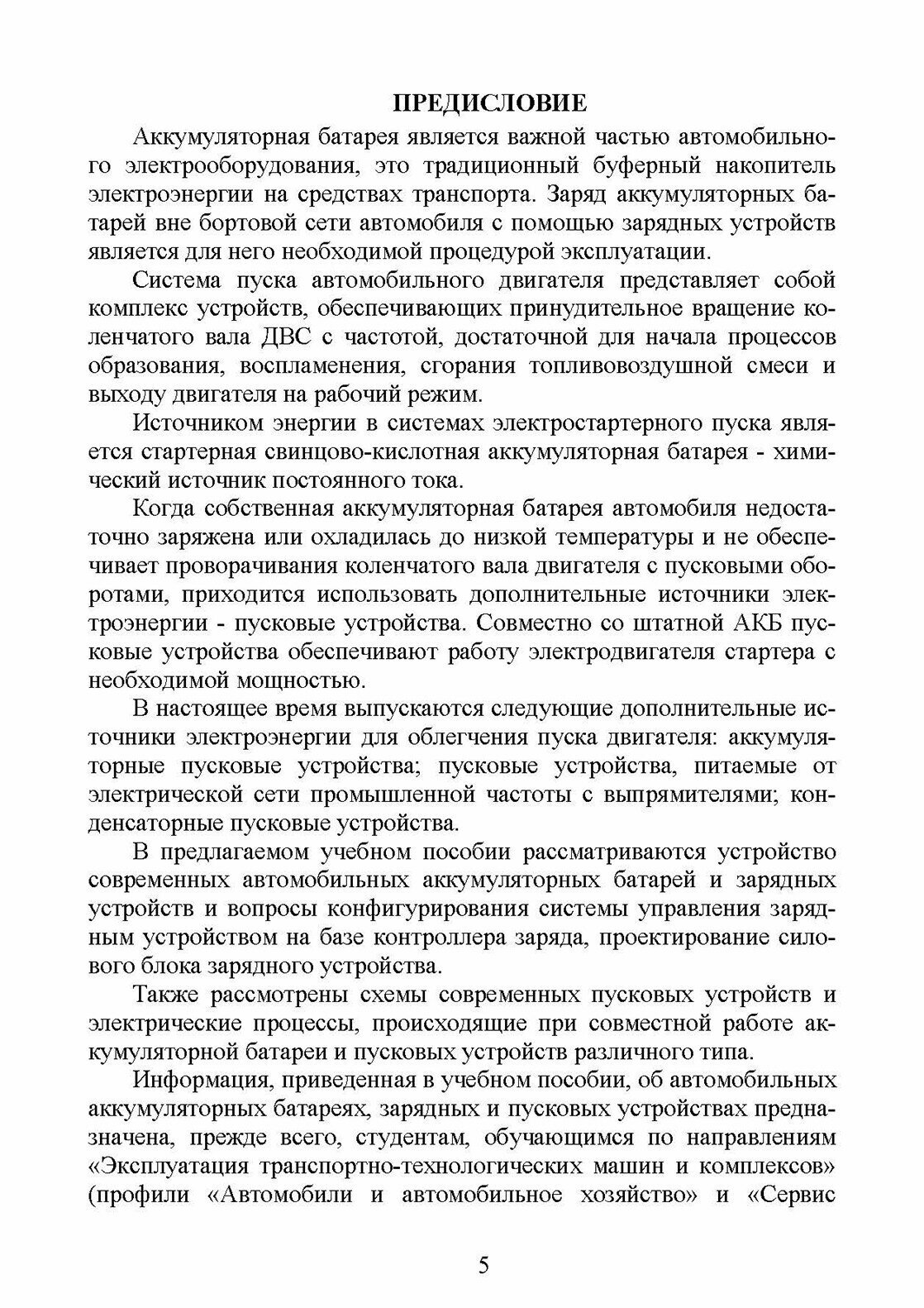 В предлагаемом учебном пособии рассматриваются: устройство современ-ных автомобильных аккумуляторных батарей и зарядных устройств, вопросы конфигурирования системы управления зарядным устройством на базе контрол-леров заряда, проектирование силового блока зарядного устройства. Рассмо-трены также схемы современных пусковых устройств и электрические процес-сы, происходящие при совместной работе аккумуляторной батареи и пусковых устройств различного типа.Информация, приведенная в учебном пособии, об автомобильных аккуму-ляторных батареях, зарядных и пусковых устройствах предназначена, прежде всего, студентам, обучающимся по направлениям подготовки высшего образо-вания «Эксплуатация транспортно-технологических машин и комплексов» и «Электроэнергетика и электротехника».