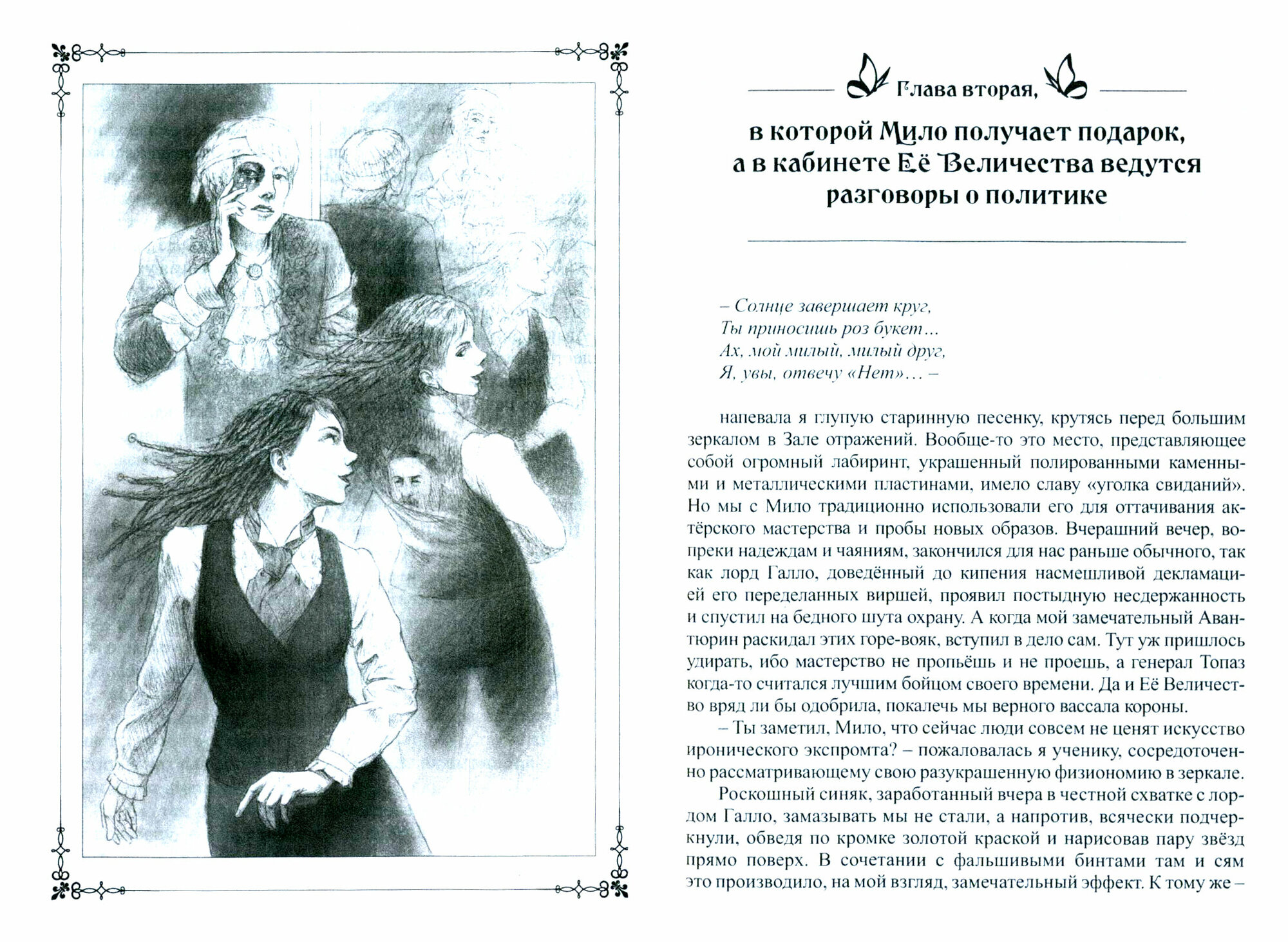 Прочитала несколько раз еще первое издание. Роман потрясающий. Маленький капризный шут девчонка, которая может все. Даже нагрубить королеве. Нахамить окружающим и ее не накажут. За что ее и не любят окружающие и считают свихнувшейся. Можно даже сравнить с картой шута в таро. Она не знает или не хочет знать, что такое любовью Но это не минует и ее. В книги есть тайный смысл, есть над чем подумать.
