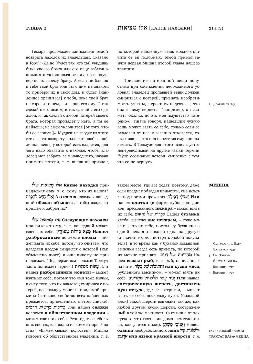 Талмуд — свод правовых и морально-этических положений иудаизма, охватывающий Мишну — основу еврейской устной традиции и Гемару — дискуссии, которые велись законоучителями Земли Израиля и Вавилонии на протяжении пяти столетий, и представляющий собой основной источник Устной Торы. Различаются Вавилонский и Иерусалимский Талмуды; Вавилонский Талмуд обладает большим авторитетом и является основным предметом традиционной еврейской системы обучения. В настоящий том, восьмой из многотомного издания, вошел оригинальный текст и русский перевод второй и третьей глав трактата Бава-Мециа. В основе издания лежит принцип общедоступности, оно призвано помочь читателю самостоятельно познакомиться с полным текстом Талмуда на русском языке. Перевод сопровождается краткими комментариями, опирающимися на комментарии крупнейшего средневекового ученого-талмудиста Раши. В дальнейшем планируется выпустить в свет перевод всех трактатов Талмуда.