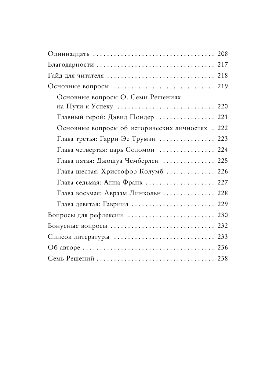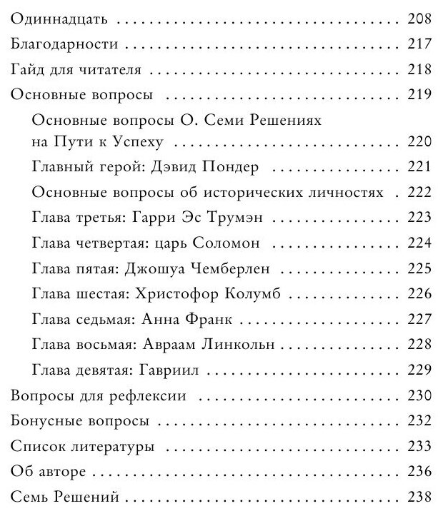 Это не типичная книга по саморазвитию и успеху) Она написана как фэнтези, благодаря чему мы сами вместе с главным героем Дэвидом открываем для себя семь секретов. Дэвид оказывается в сложной ситуации, и вот семь личностей, которых он встречает (Трумэн, царь Соломон, Чемберлен, Колумб, Анна Франк, Линкольн, архангел Гавриил), помогают ему найти свой путь и себя. Каждый учит Дэвида (и нас) какой-то мудрости. В конце автор предлагает вопросы, чтобы мы могли поразмышлять над проблемами, поднятыми в книге. Занимательное, легкое, свежее чтение)