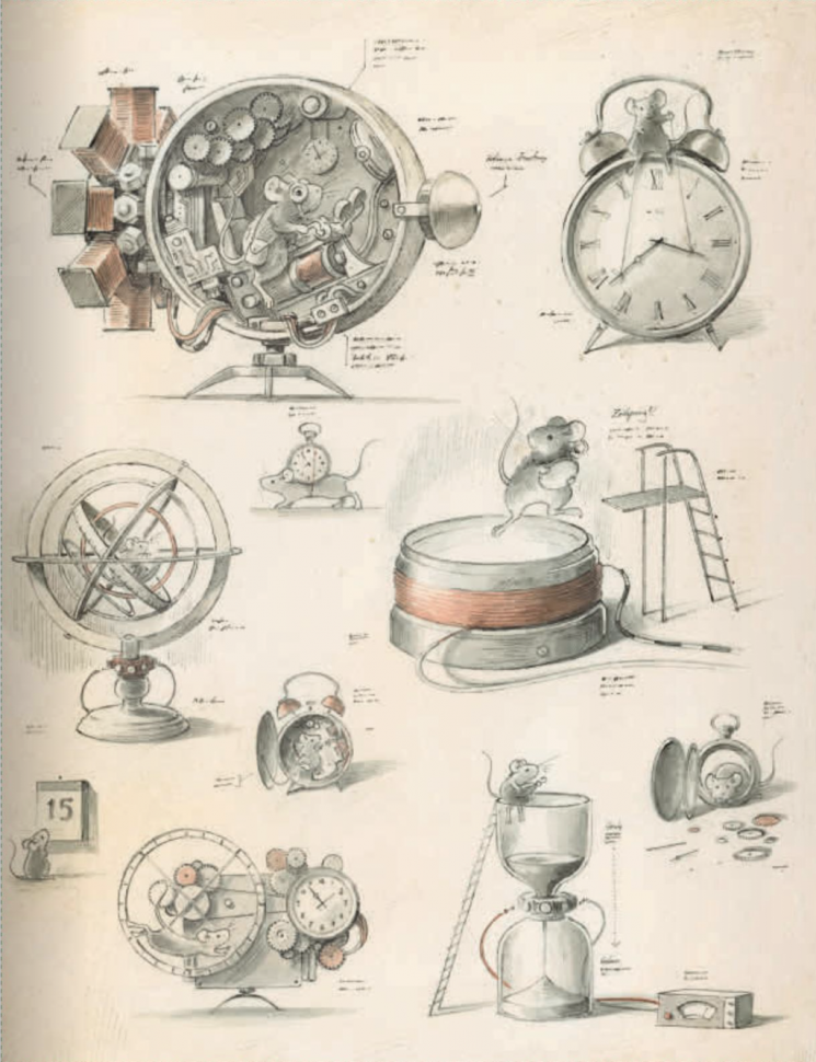 Еще вчера мышь пытается крутить стрелки на часах назад, чтобы вернуть вчерашний день, но пообщавшись с часовщиком и получив удар по голове нужной книгой, как Ньютон, вдруг, в одночасье изобретает... машину времени! Вау!
