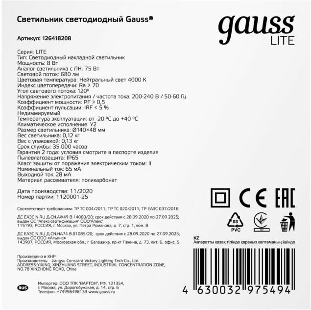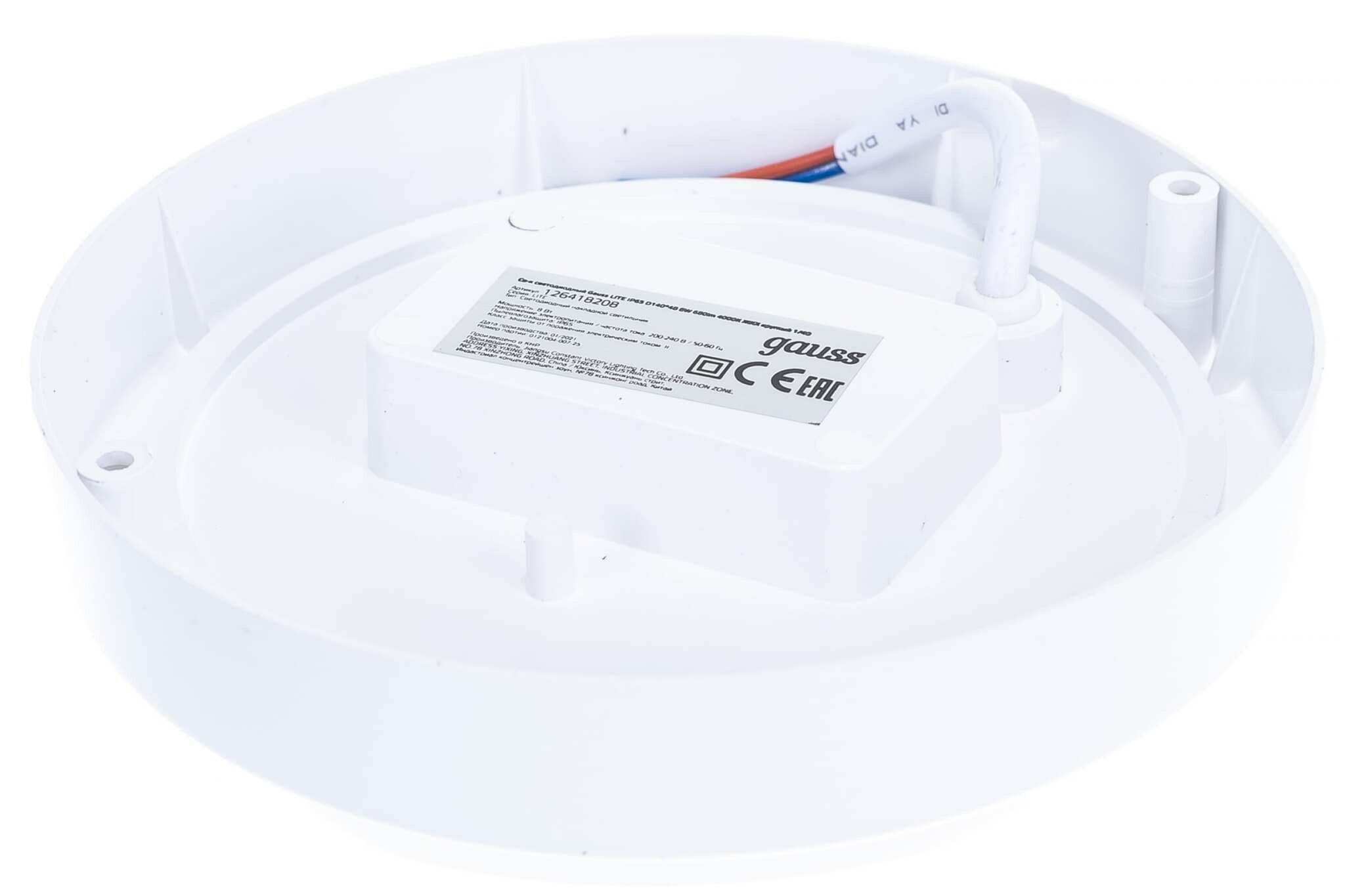 Светильник ЖКХ Gauss LITE круг 8W 680lm 4000K 160-260V IP65 D140*51мм белый 1/40, предназначен для общего освещения наземных/подземных проходов, проездов, подъездов, лестничных клеток, входных групп, балконов, технических и подсобных помещений, в том числе с повышенными требованиями к пылевлагозащите до IP65.