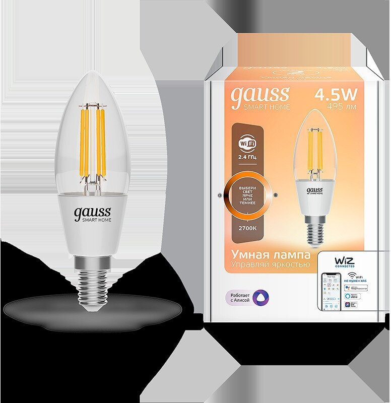 В серии Gauss Smart Home доступны две группы филаментных ламп. Лампы первой группы внешне схожи с классическими лампами накаливания, и потому прекрасно смотрятся в люстрах и бра.