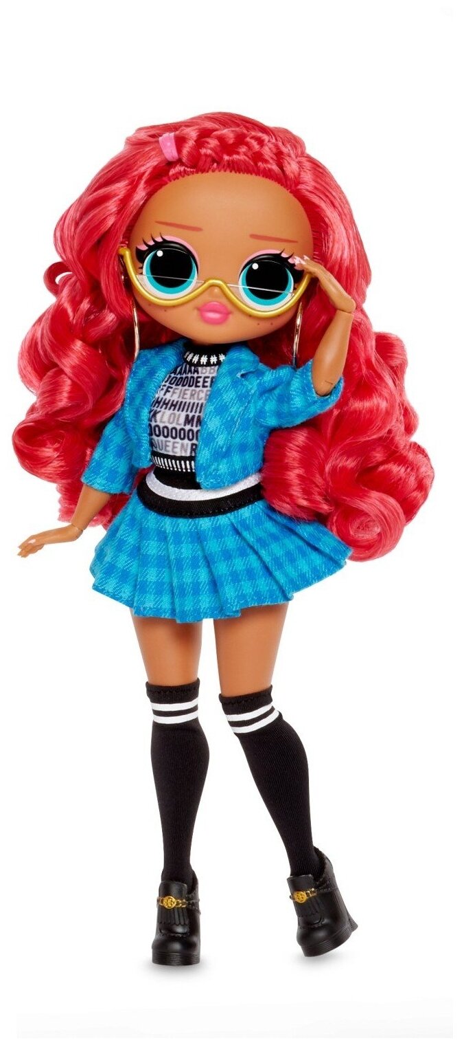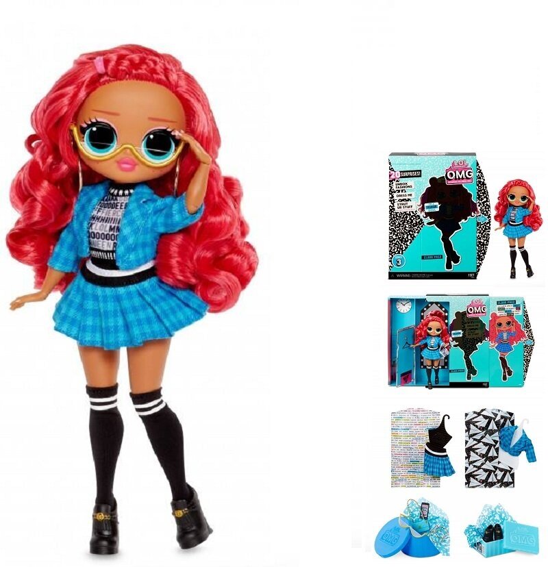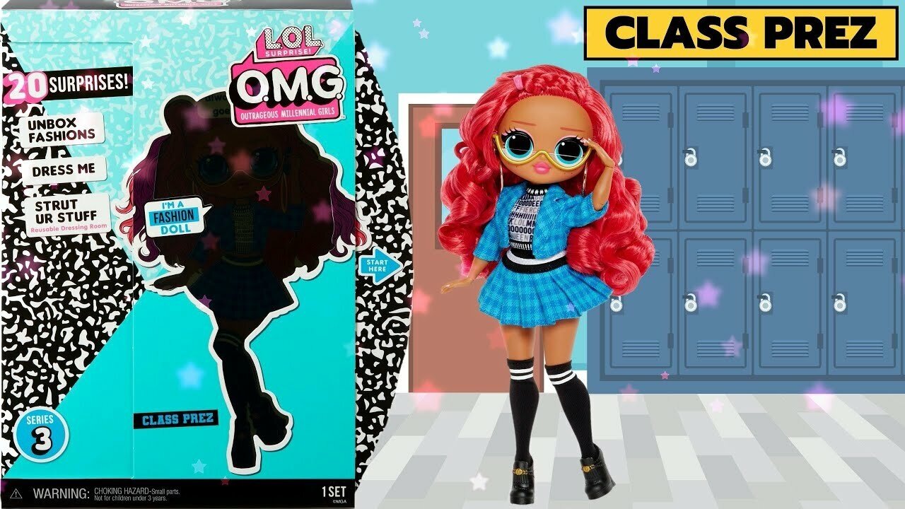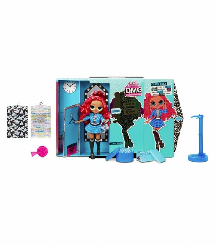 LOL OMG Class Prez из 3 серии фэнш кукол высотой 25 см. У нее длинные волнистые красные прошитые волосы и голубые глаза. Class Prez одета в черно-белый пестрый топ и костюм из пиджака и юбку в синюю шотландскую клетку. На ножках черные гольфы и ботинки. Кукла находится в упаковке в виде гардеробной комнаты, а комплекты одежды, обуви и аксессуаров спрятаны в чехлы для одежды, обувную и шляпную коробки. В наборе также есть подставка для куклы.