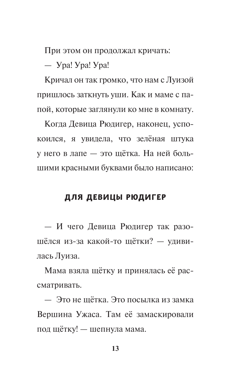 Всю нашу семью пригласили на праздник в замок Вершина Ужаса! Там живут ведьмы и вампиры, и поэтому Луизе, моей лучшей подруге, нельзя поехать с нами. Но вышло так, что Луиза всё же смогла отправиться на вечеринку на нашей летающей трубе. Но произошло страшное — подействовало древнее заклятие и Луиза превратилась в камень! Мама берётся приготовить волшебный эликсир №13, но вдруг он не подействует и Луиза навсегда останется каменной статуей в Замке Ужаса?!