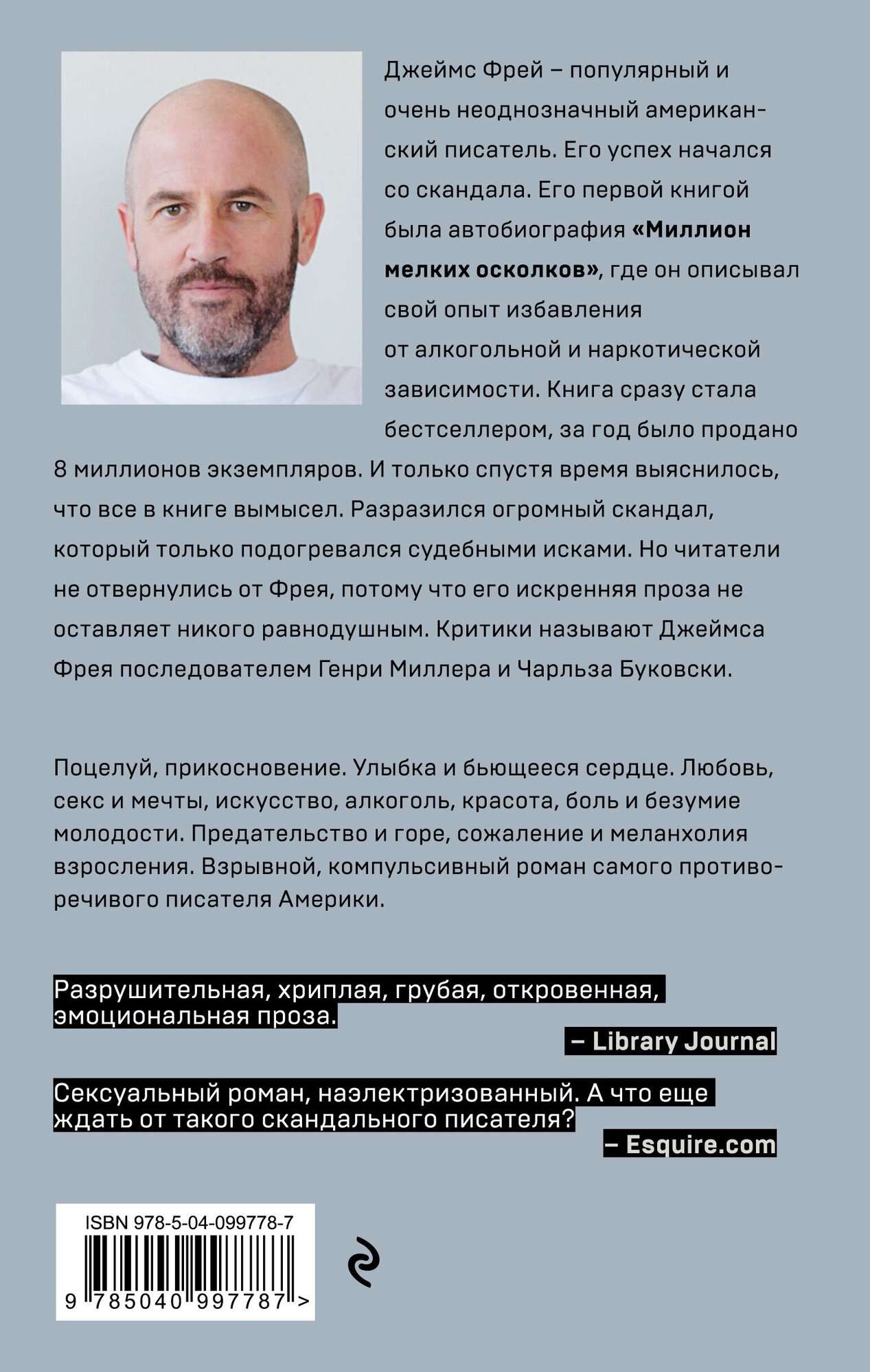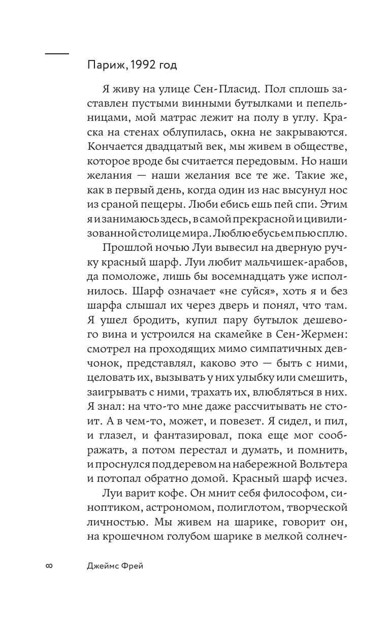 О Джеймсе Фрейе говорят разное, ведь не зря книга издается в серии «самые провокационные писатели». Честно, уже не знала, что ожидать от этого автора. Купила на свой страх и риск, потому что понимала, что будет два варианта: или любовь с первой страницы, или книга мне не зайдет. Но, о чудо, книгу я с удовольствием дочитала до конца. Очень советую прочитать ее не опираясь на рецензии – так впечатлений будет больше, уж поверьте. Очень интересный роман с отлично прописанные персонажами, а обложка цепляет просто сразу же, как только на нее посмотришь .Просто взяв книгу в руки, положить обратно ты ее уже не сможешь