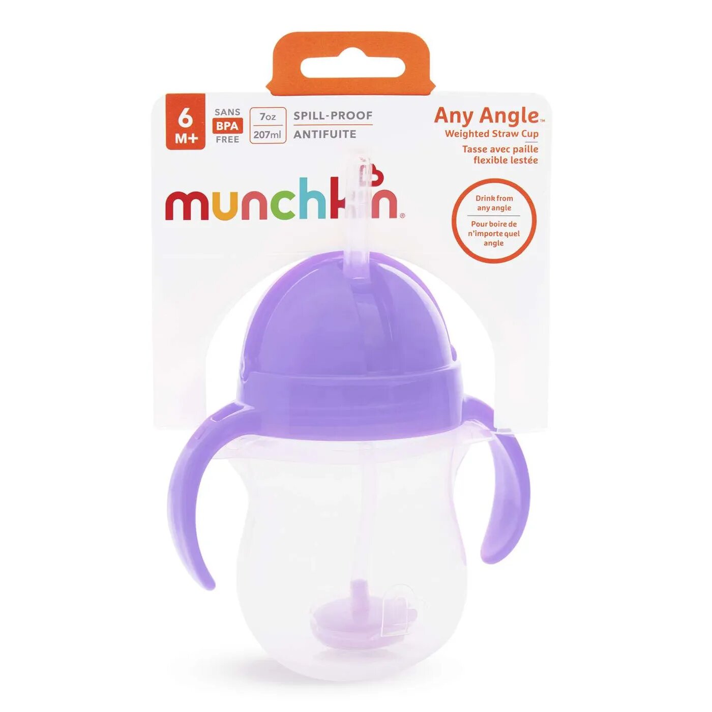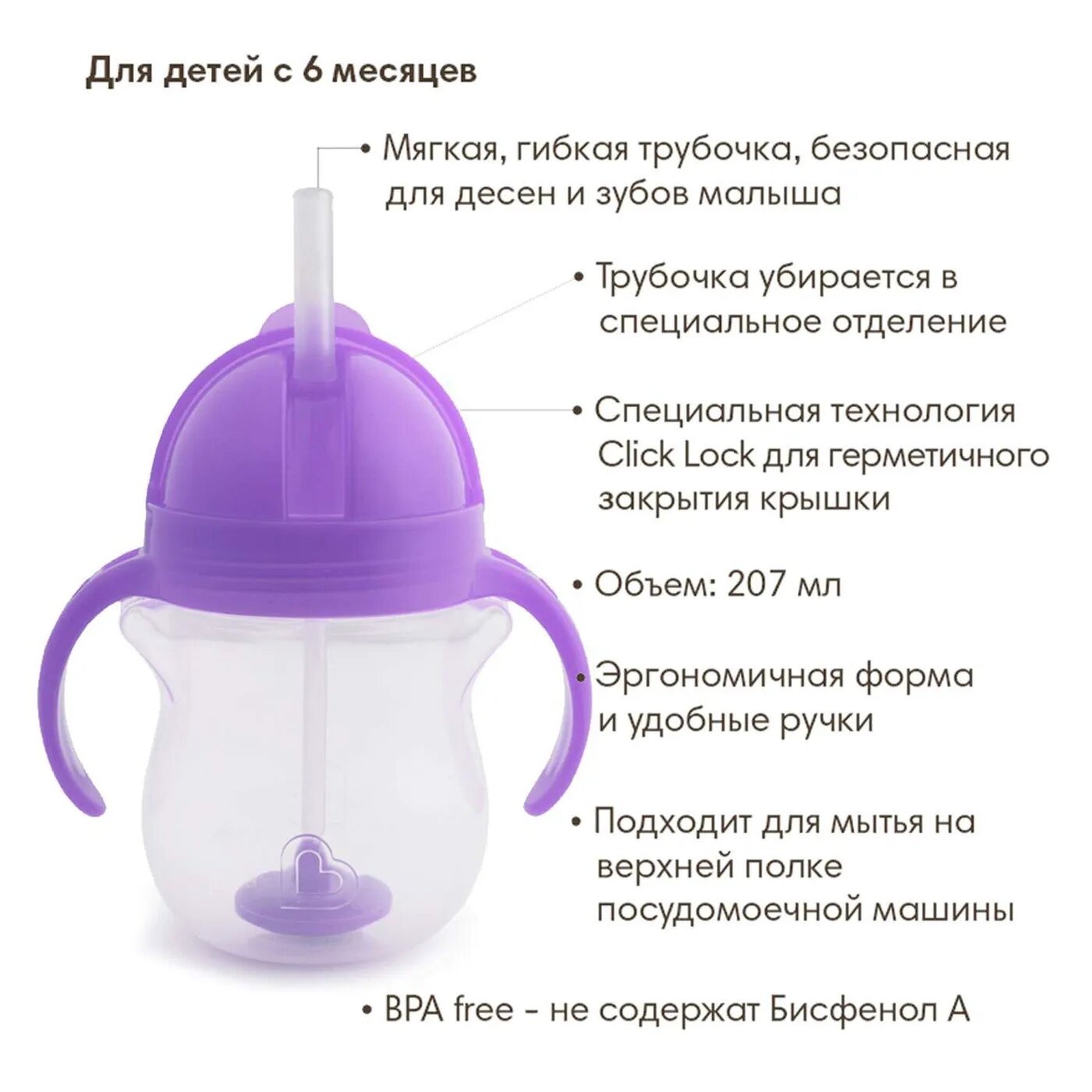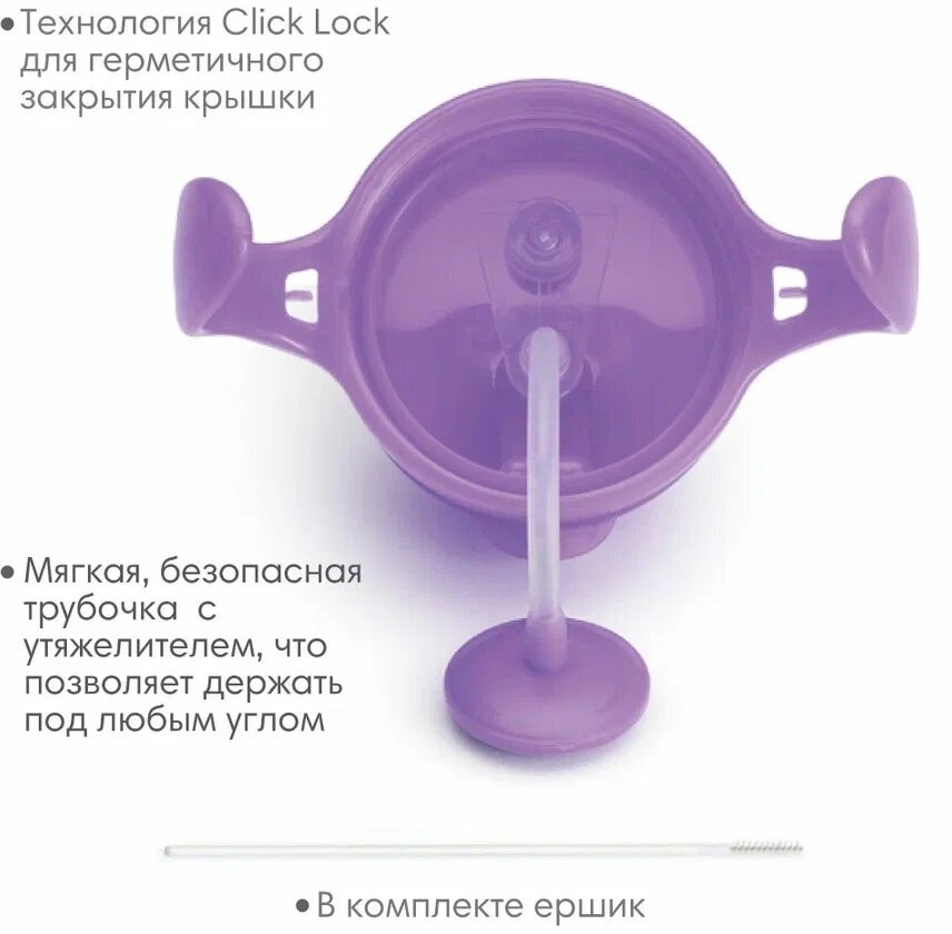 Поильник MunchkinClick Lock™Any Angle™ с трубочкой и с ручками Возраст: от 6 месяцев В этом поильникеClick Lock™ Any Angle™ от Munchkin объединились компактная мягкая бутылочка и удобная соломинка, из которой малышу будет весело пить любимый напиток. Такой поильник идеален для подготовки ребенка к взрослой чашке, а также для путешествий и прогулок: с откидной крышкой Flip Top ребенок может безопасно пить из него прямо на ходу и во время движения. Мягка и гибкая трубочка сделает питье еще более комфортным, но безопасным для нежных десен малыша. Этот удобный поильник с трубочкой можно держать под любым углом во время питья и не бояться проливания жидкости. Поильник равномерно распределяет напиток, как бы ни был повернут или наклонен поильник. Особенности: герметичная конструкция позволяет держать поильник под любым углом без проливания специальная технологияClick Lock™для герметичного закрытия крышки мягкая, гибкая трубочка, безопасная для десен и зубов малыша эргономичная форма, удобные ручки в комплекте кисточка для легкой очистки трубочки трубочка убирается в специальное отделение не содержит Бисфенол А подходит для мытья на верхней полке посудомоечной машины объем: 207 мл возраст: от 6 месяцев Для комфортного мытья и чистки бутылочек и поильников Munchkin используйтеЕршики для мытья поильников и бутылочек Munchkin.
