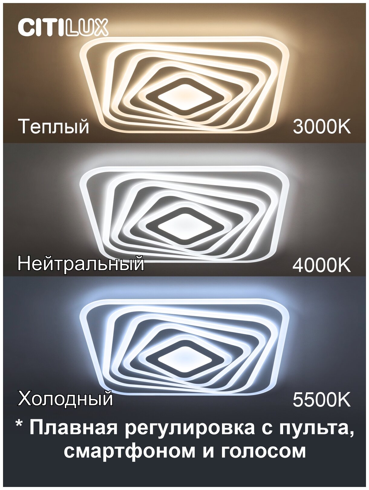 Светодиодная потолочная люстра Citilux Триест Смарт CL737A45E с голосовым управлением является ярким представителем современных умных хай-тек светильников экосистемы Citilux SMART. Выпускается с рассеивателем из оптического полимера с белыми декоративными элементами. Светильник накладной, квадратной формы, с закругленными углами. Крепление подходит для всех типов потолков, в том числе натяжных. Моделью можно управлять: из приложения на смартфоне по Wi-Fi при наличии интернета, с помощью голосовых помощников Алиса и Маруся, есть возможность запуска настроенных сценариев с помощью Сири, а также пультом дистанционного управления и с настенного выключателя. У модели пять светящихся ярусов, которые могут светить как синхронно одним цветом, так и через один разными цветовыми температурами. Для этого перед монтажом, необходимо оставить или убрать специальную перемычку в коммутации. Диапазон регулировок цветовой температуры от 3000 до 5500К. RGB подсветка включается отдельно или совместно с основным светом. Мощность светильника 120Вт, с диммером и функцией плавной регулировки.
