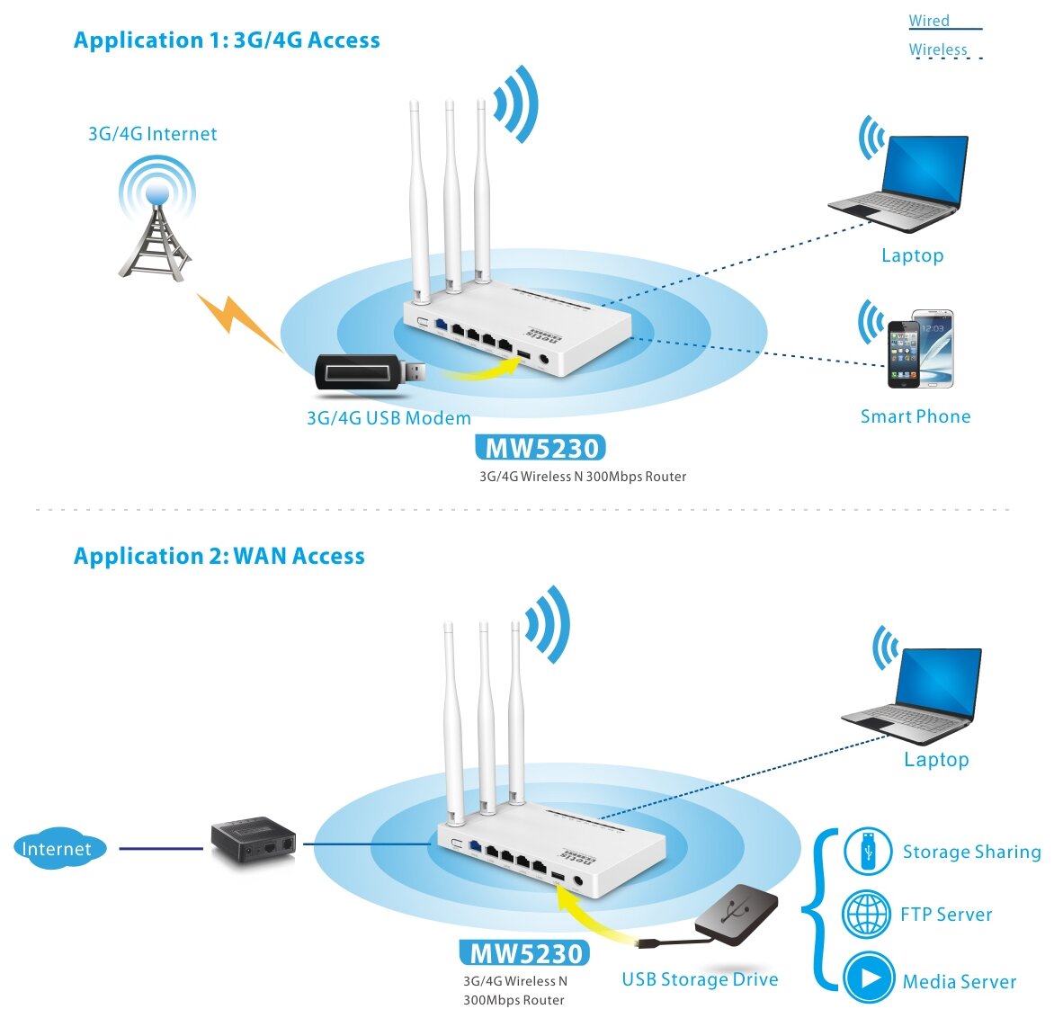 Роутер поддерживает соединения с 3G/4G USB модемами для подключения к сети интернет, а так же традиционное подключение по Ethernet через кабель к порту WAN со скоростью беспроводной передачи данных до 300Mbps. Имеет поддержку протоколов TR-069, а так же IPv6.