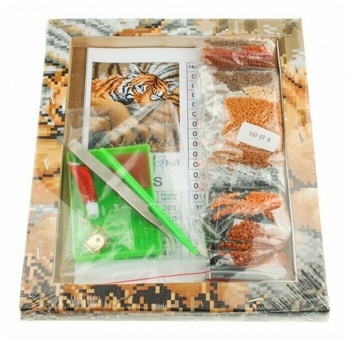 Соберите спящего тигрёнка с помощью комплекта ярких акриловых камней и металлического пинцета. Основой работы является холст, на котором напечатана цветная схема с контрастными условными обозначениями.