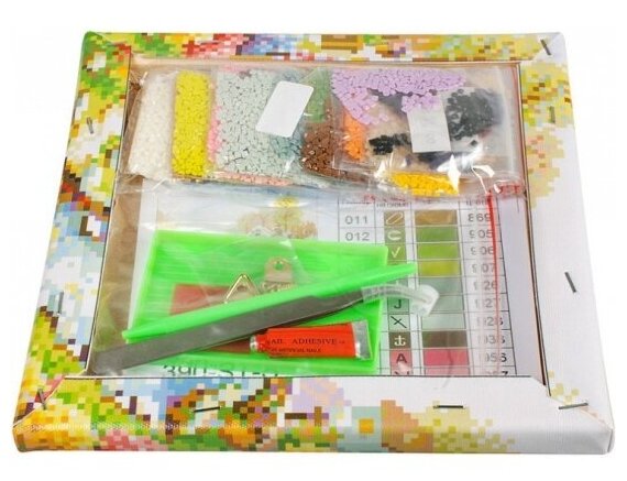 | Комплектация | Холст на подрамнике с клеевой основой, Условные обозначения, Акриловые камни-стразы, Жидкий клей, пинцет, Блюдце, Инструкция, Крепеж для подвешивания. |