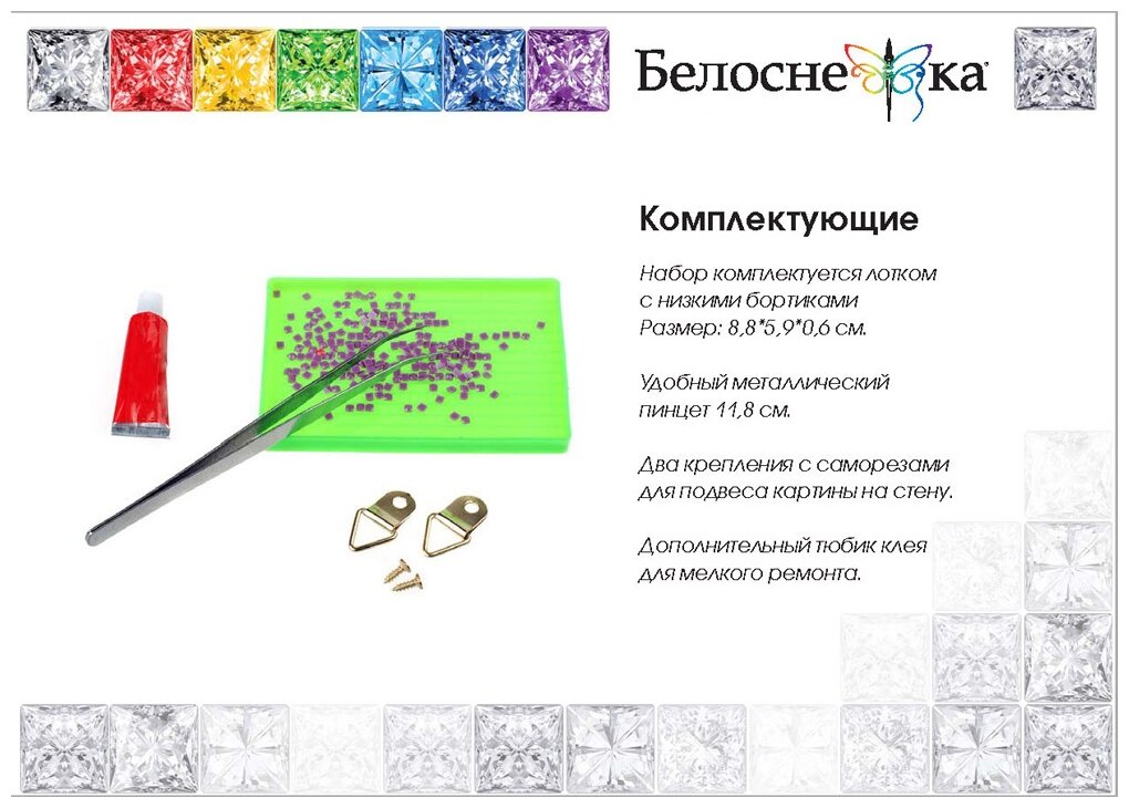 | Комплектация | Холст с нанесенной схемой и клеевым покрытиемКомплект квадратных камней с огранкой 2.5 х 2.5 ммПластмассовый лоток с ячейкамиПинцет металлическийДополнительный тюбик клеяЛистовка-ключ к схеме |