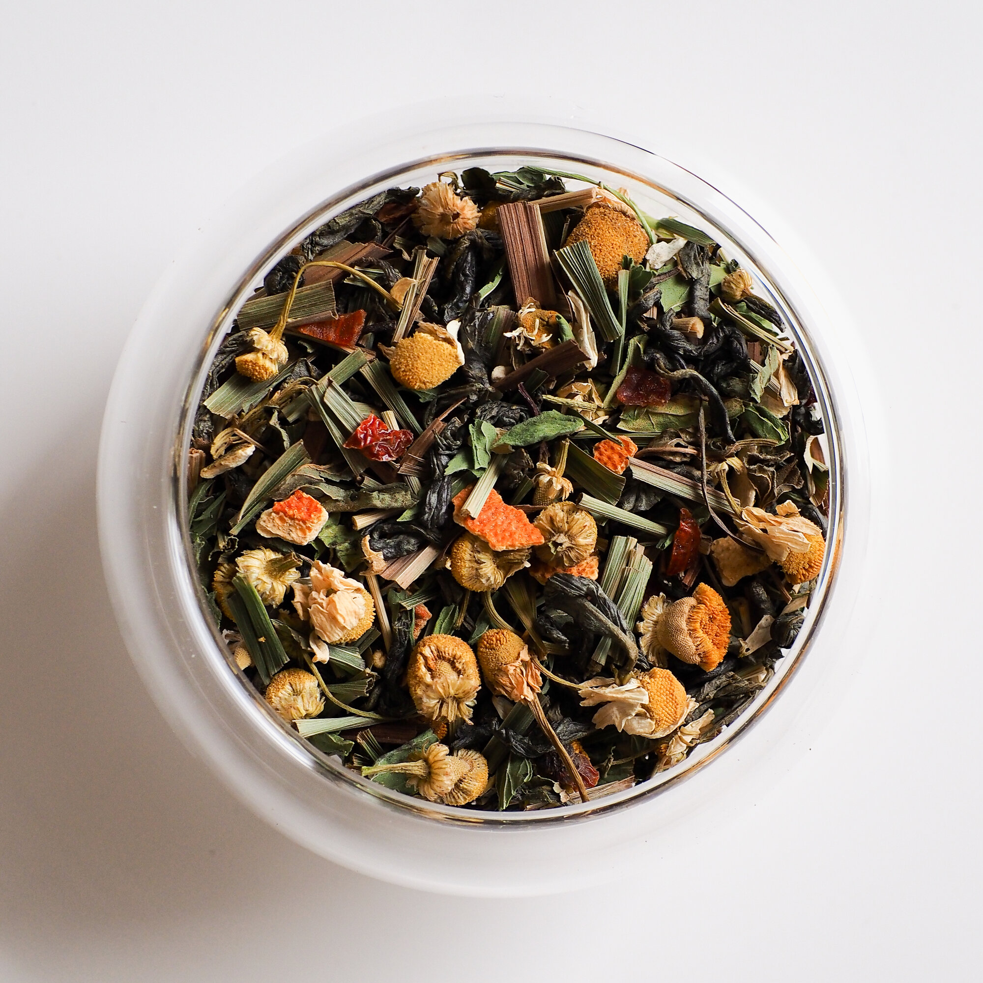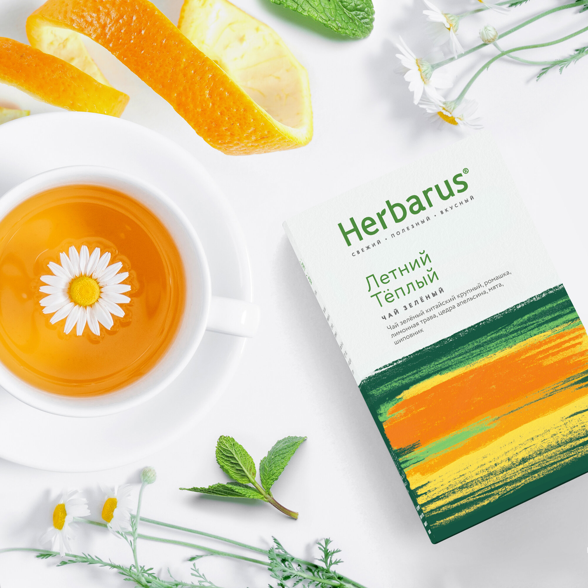 | Состав | Чай зеленый китайский крупный, ромашка, лимонная трава, цедра апельсина, мята, шиповник. |