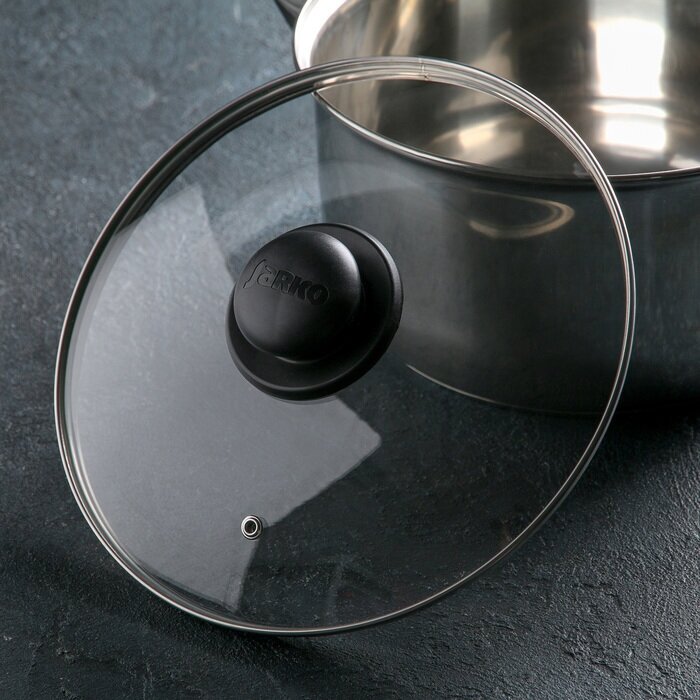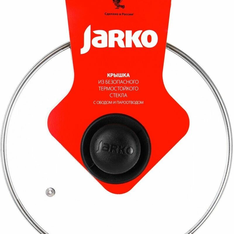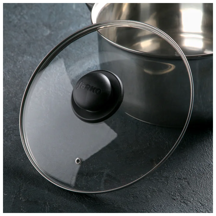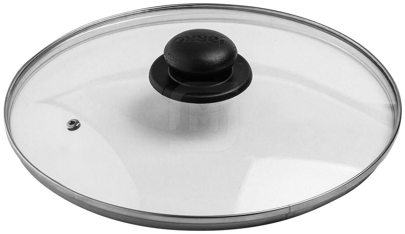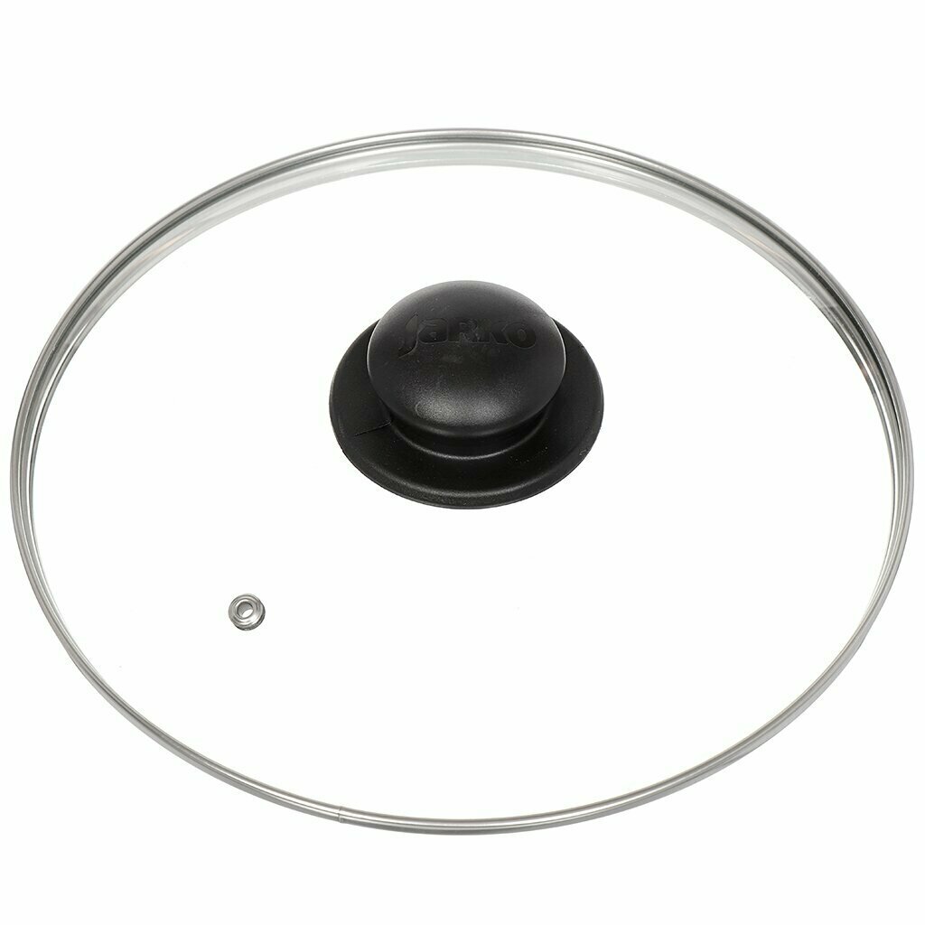 JARKO – стеклянная жаропрочная крышка с паровыпускным клапаном, в ободе из нержавеющей стали и ручкой в упаковке.