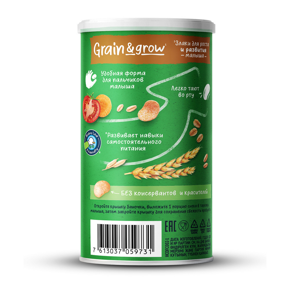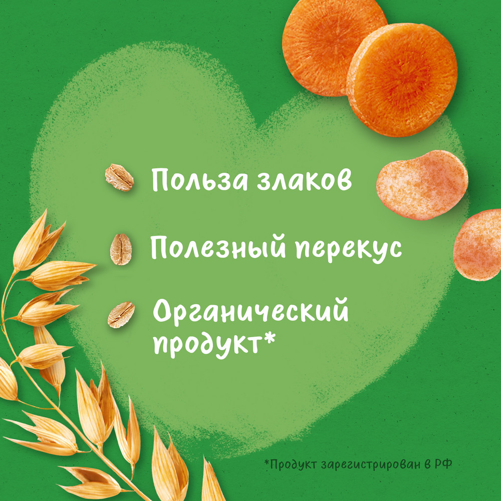 Пшенично-овсяные снеки с томатом и морковью - вкусный и полезный перекус, специально разработанный для годовалого малыша, который может остаться его любимым лакомством и в более старшем возрасте. Этот продукт - здоровое сочетание цельных злаков и овощей, выращенных по принципам органического земледелия.