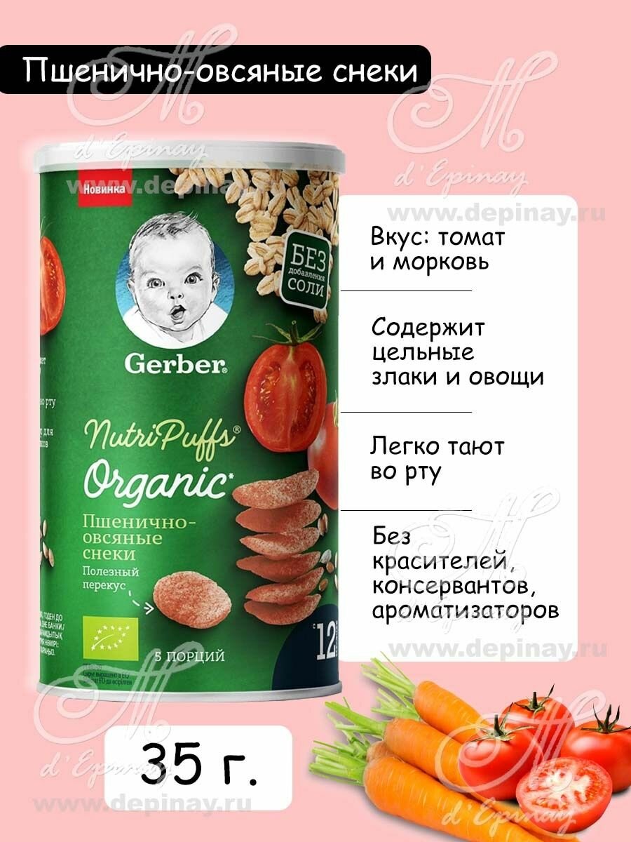 На сегодняшний день товар «Gerber® Organic Пшенично-овсяные снеки с томатом и морковью 35г (12446136)» можно купить с кешбеком в 1 магазине: Яндекс.Маркет