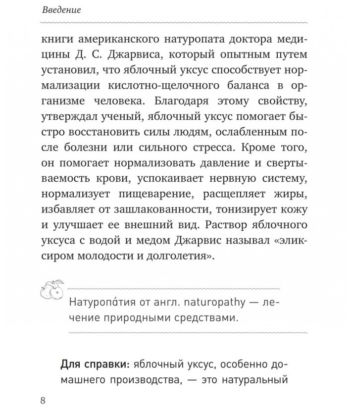 Увидела эту книгу в каталоге и сразу купила. Хотя книга пришла с большим опозданием, но это не важно! Книга заслуживает подождать. Книга содержит большое количество материала про яблочный уксус от пользы в медицинских целях до косметологии. Многое я уже знала и многое из книги открыла нового для себя. Книга читается с большим интересом и даже с огромным любопытством. Рада, что приобрела эту нужную книгу.