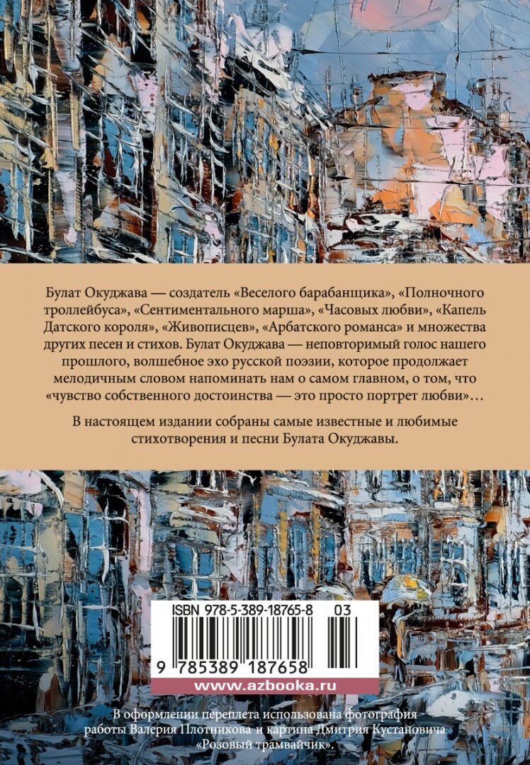 Замечательный сборник! Отлично собраны и сгруппированы произведения, прекрасное качество печати и оформление. Это было моё первое знакомство с Булатом Окуджавой, но я нашла свои стихотворения и песни))