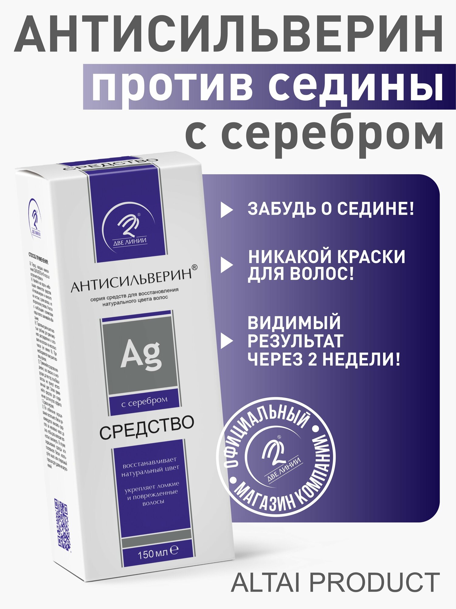 Эффективное средство против седины:за 2-3 недели седые волосы вновь приобретут натуральный цвет;укрепляет ломкие и поврежденные волосы;уменьшает образование перхоти;защищает от воздействия прямых солнечных лучей и неблагоприятных экологических факторов.Антисильверин – удобное и безопасное средство от седины и для восстановления натурального цвета волос. Алтайские ученые разработали препарат, который возвращает волосам красоту и натуральный цвет за несколько недель! Антисильверин не является ни оттеночным шампунем, ни красящей субстанцией для волос. Он непосредственно воздействует на кератин, содержащийся в наших волосах, увеличивая его наличие при регулярном использовании средства.