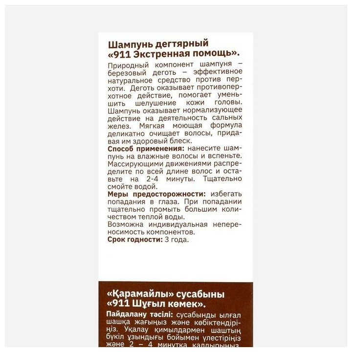 Природный компонент шампуня - березовый деготь - эффективное натуральное средство против перхоти. Деготь оказывает противоперхотное действие, помогает уменьшить шелушение кожи головы. Шампунь оказывает нормализующее действие на деятельность сальных желез. Мягкая моющая формула деликатно очищает волосы, придавая им здоровый блеск.Противоперхотный эффект;Регулирует деятельность сальных желез;Успокаивает кожу головы.Меры предосторожности: избегать попадания в глаза. При попадании тщательно промыть большим количеством теплой воды. Возможна индивидуальная непереносимость компонентов.