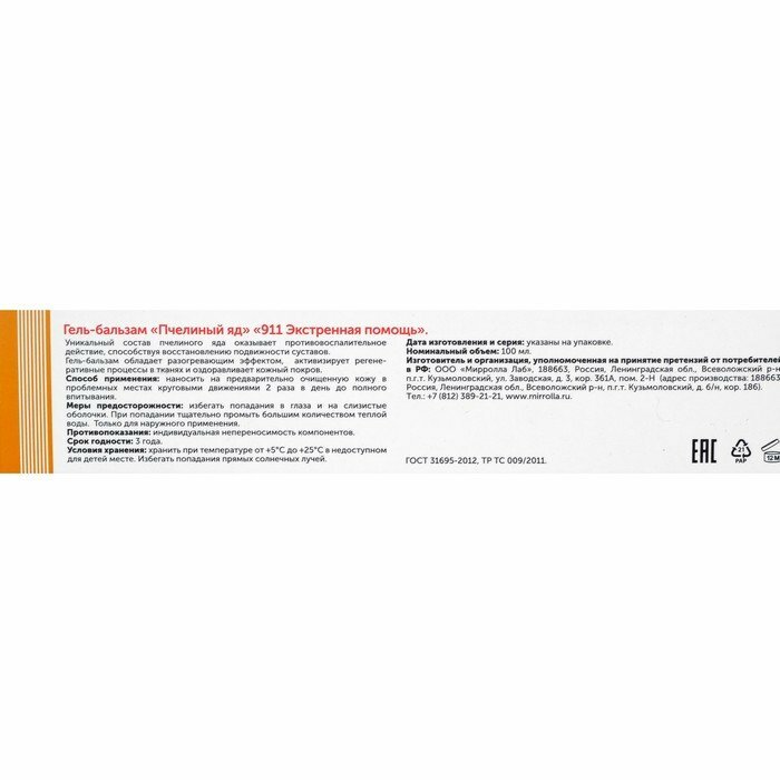 Сервис сравнения цен СкидкаГИД предлагает сравнить цены на товар «911 экстренная помощь гель-бальзам для тела "Пчелиный яд" туба 100мл ООО Мирролла Лаб (1093149)»