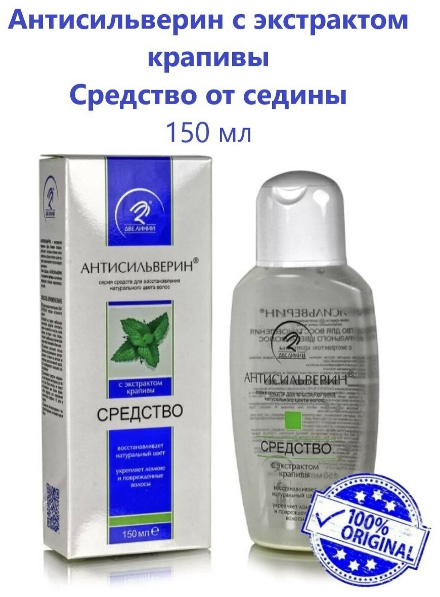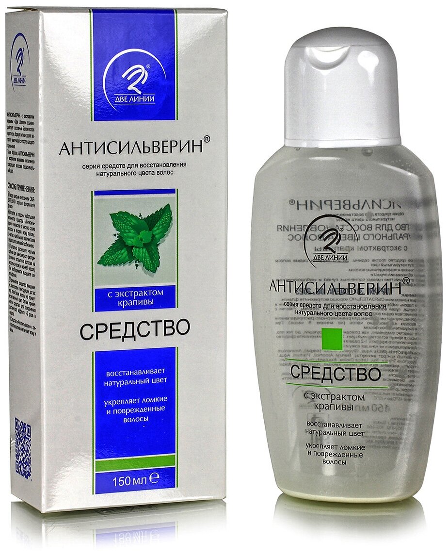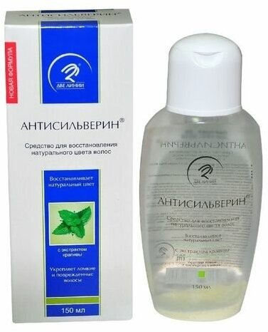 Новая уникальная разработка ученых алтайской компании «Две линии» возвращает естественный цвет волосам за 2-4 недели, делая седые волосы менее заметными и возвращая природный пигмент ослабленным волосам. «Антисильверин» взаимодействует с основным белком волос кератином, образуя красящий пигмент, доля которого увеличивается после каждого применения средства. «Антисильверин» действует мягко, но эффективно: после первых применений волосы слегка желтеют, а затем их прежняя окраска медленно и незаметно для окружающих приобретает свой естественный цвет, количество седых волос становится меньше, их белый цвет становится менее резким, пока, наконец, они совершенно не сливаются с общей массой волос. Таким образом, «Антисильверин» постепенно возвращает волосам первоначальный цвет. Усиленная экстрактом крапивы формула «Антисильверин» не только борется с сединой, но заботится о красоте волос.Восстанавливает естественный цвет волос (убирает седину);Способствует укреплению ломких и поврежденных волос, усиливает их рост;Помогает уменьшить возникновение перхоти;Эффективная защита волосяного покрова при наличии различных внешних воздействий (прямые солнечные лучи, факторы экологии);При использовании не оставляет следов на коже и постельном белье.