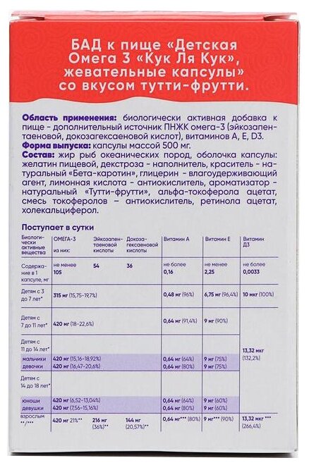Сервис сравнения цен СкидкаГИД предлагает сравнить цены на товар «Детская Омега-3 "Кук ля кук" со вкусом тутти-фрутти капс. жеват. 500мг 100 шт. ООО Мирролла (570836)»