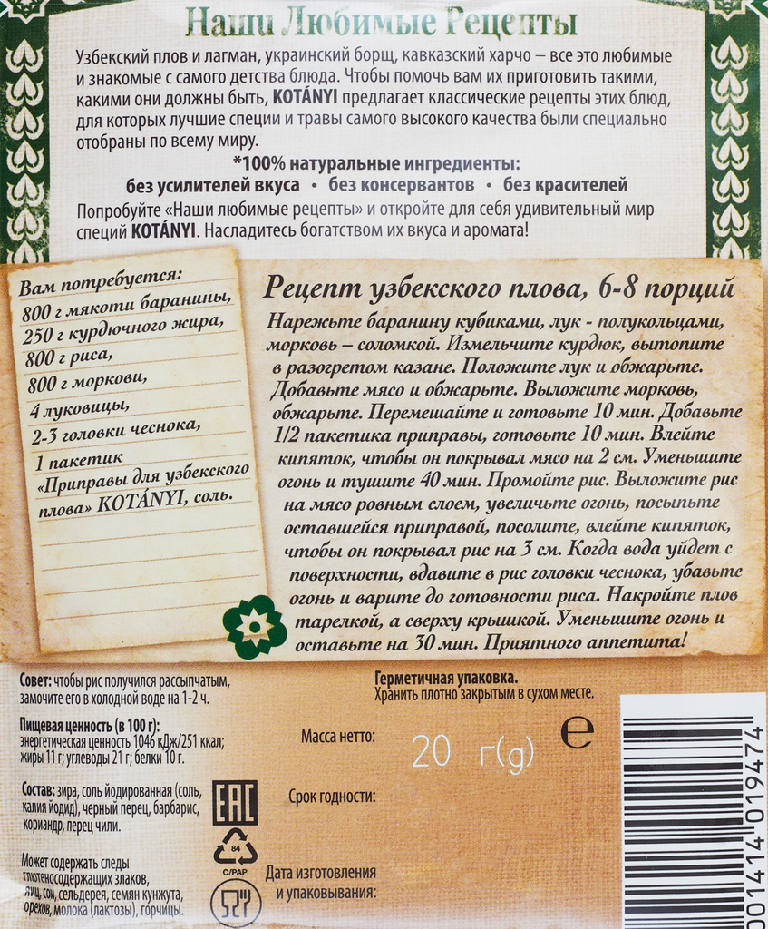 Описание товара:Узбекский плов и лагман, украинский борщ, кавказский харчо - все это любимые и знакомые с самого детства блюда. Чтобы помочь вам их приготовить такими, какими они должны быть, Kotanyi предлагает классические рецепты этих блюд, для которых лучшие специи и травы самого высокого качества были специально отобраны по всему миру. *100% натуральные ингредиенты: без усилителей вкуса; без консервантов; без красителей. Попробуйте "Наши любимые рецепты" и откройте для себя удивительный мир специй Kotanyi. Насладитесь богатством их вкуса и аромата!Состав товара:Зира, соль йодированная (соль, калия йодид), чёрный перец, барбарис, кориандр, перец чили). Может содержать следы глютеносодержащих злаков, яиц, сои, сельдерея, семян кунжута, орехов, молока (лактозы), горчицы.Способ приготовления:Вам потребуется: 0,8 кг мякоти баранины, 0,25 кг курдючного жира, 0,8 кг риса, 0,8 кг моркови, 4 луковицы, 2-3 головки чеснока, 1 пакетик "Приправы для узбекского плова" Kotanyi, соль. Рецепт узбекского плова, 6-8 порций. Нарежьте баранину кубиками, лук - полукольцами, морковь - соломкой. Измельчите курдюк, вытопить в разогретом казане. Положите лук и обжарьте. Добавьте мясо и обжарьте. Выложите морковь, обжарьте. Перемешайте и готовьте 10 мин. Добавьте 1/2 пакетика приправы, готовьте 10 мин. Влейте кипяток, чтобы он покрывал мясо на 2 см. Уменьшите огонь и тушите 40 мин. Промойте рис. Выложите рис на мясо ровным слоем, увеличьте огонь, посыпьте оставшейся приправой, посолите, влейте кипяток, чтобы он покрывал рис на 3 см. Когда вода уйдет с поверхности, вдавите в рис головки чеснока, убавьте огонь и варите до готовности риса. Накройте плов тарелкой, а сверху крышкой. Уменьшите огонь и оставьте на 30 мин. Приятного аппетита! Совет: чтобы рис получился рассыпчатым, замочите его в холодной воде на 1-2 ч.
