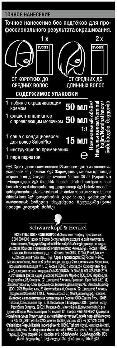 | Комплектация | тюбик с ухаживающим окрашивающим кремом, флакон-аппликатор с проявляющим молочком, саше с кондиционером для волос SalonPlex, 1 пара перчаток. |