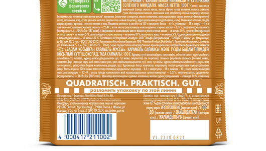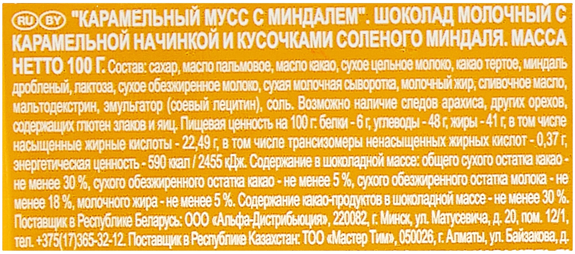 Описание товара:Что делает наш новый сорт таким неповторимым? Это нежно взбитый, удивительно воздушный карамельный мусс. И поскольку им невозможно насытиться, мы наполнили муссом необычайно крупные дольки, добавили слегка подсоленные, обжаренные кусочки миндаля и покрыли всё это молочным шоколадом. Этот mousse have нужно просто попробовать.Состав товара:Сахар, масло какао, какао тертое, сухое цельное молоко, лактоза, сухое обезжиренное молоко, молочный жир, эмульгатор (соевый лецитин), натуральный ароматизатор (экстракт бурбонской ванили). Начинка: масло пальмовое, миндаль дробленый, сахар, сухая молочная сыворотка, сливочное масло, мальтодекстрин, сухое обезжиренное молоко, молочный жир, лактоза, сухие сливки, эмульгатор (соевый лецитин), соль. Может содержать следы арахиса, других орехов, глютена и яиц.Меры предосторожности:Хранить при относительной влажности воздуха не более 65%.