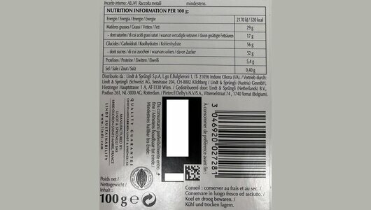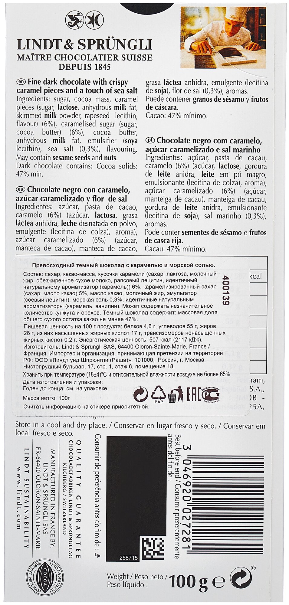 | Состав | сахар, какао-масса, кусочки карамели (сахар, лактоза, молочный жир, обезжиренное сухое молоко, рапсовый лецитин, натуральный ароматизатор (карамель)) 5%, карамелизированный сахар (сахар, какао масло) 5%, какао-масло, молочный жир, эмульгатор (соевый лецитин), мелкокристаллическая морская соль 0,3%, идентичные натуральным ароматизаторы (карамель, ваниль). может содержать незначительное количество кунжута и других орехов. |