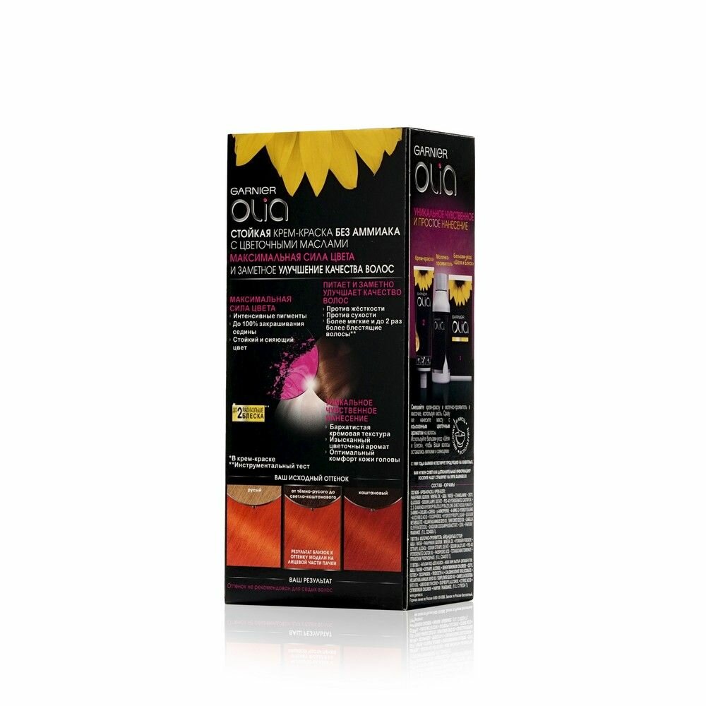 Крем-краска для волос Garnier Olia 3.16 обеспечивает ровный и насыщенный цвет, а также полное закрашивание седины. Не содержит аммиака — бережно воздействует на локоны и не повреждает структуру. Цветочные масла в составе — увеличивают глубину оттенка, придают естественное сияние и здоровый блеск. Бальзам возвращает прядям мягкость, гладкость и шелковистость. Оставляет легкий ненавязчивый аромат. Кремовая текстура — наносится легко и равномерно. Не выцветает и не тускнеет длительное время.Способ применения: следовать инструкции из упаковки.
