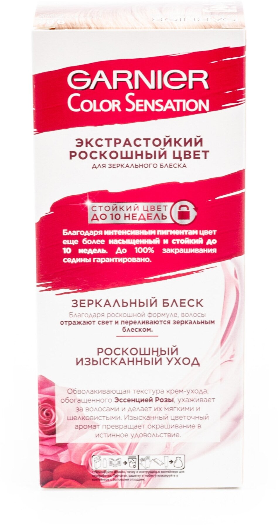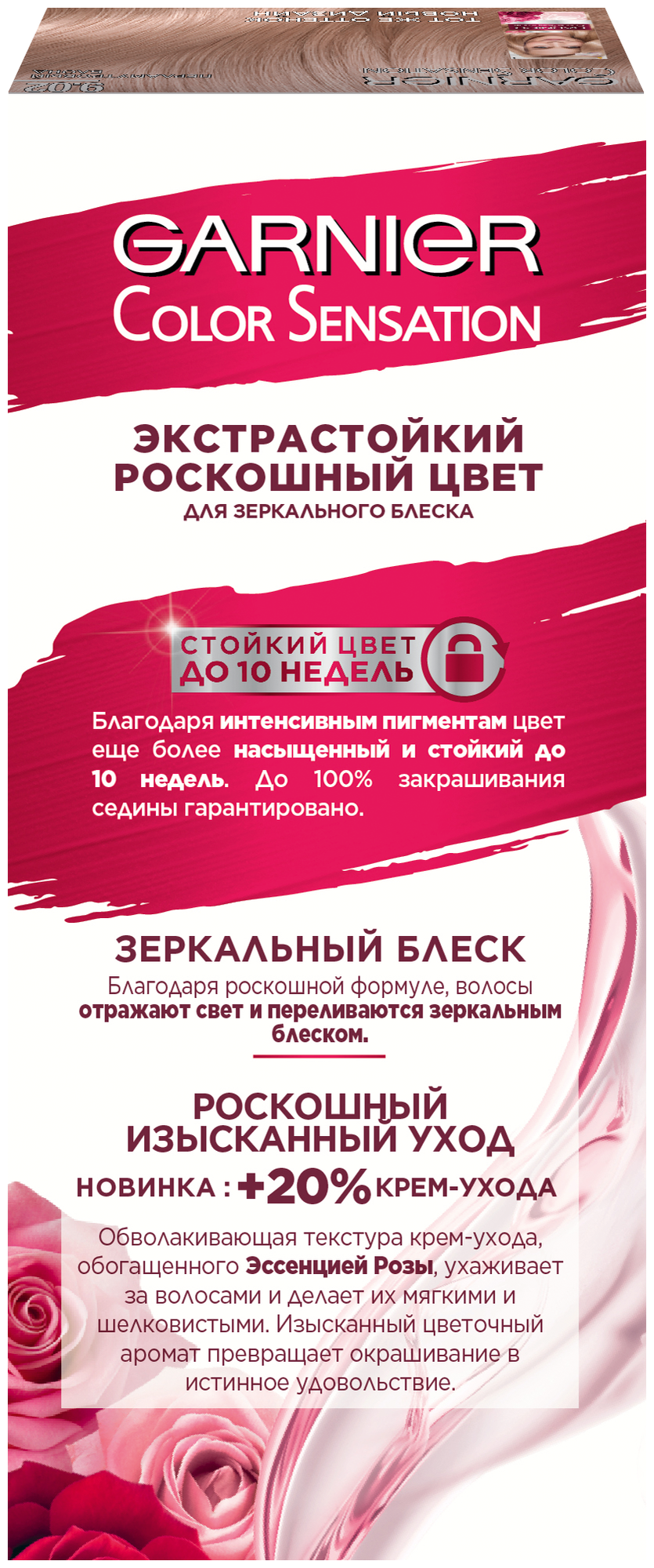 Краска для волос GARNIER Color Sensation содержит интенсивные пигменты для роскошного результата: выразительный, экстрастойкий и точный цвет. Благодаря формуле, обогащенной перламутром и цветочным маслом, волосы переливаются зеркальным блеском и отражают свет.