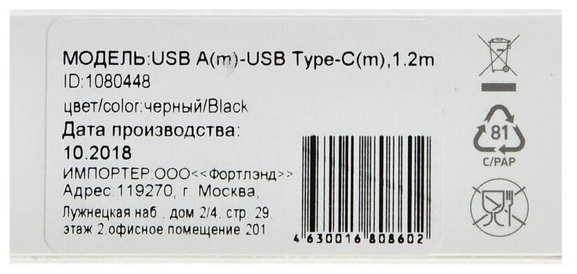 Модель: USB A(m) USB Type-C (m) 1.2м черный