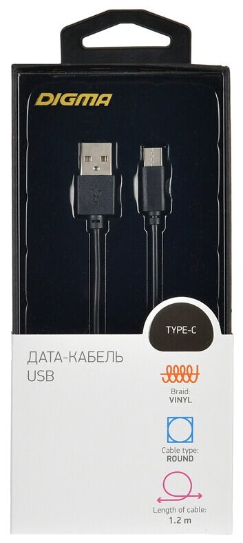 Кабель Digma черный, коннекторы USB (m)-USB Type-C (m), длина 1.2м, (TYPE-C-1.2M-BLK)