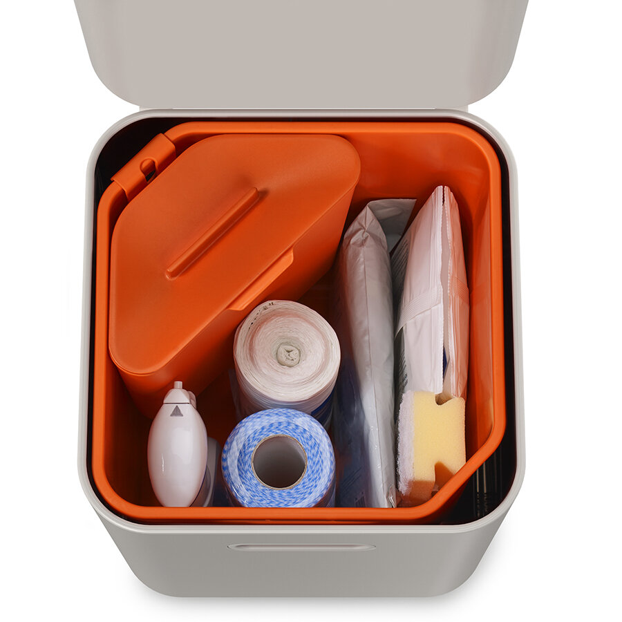 Верхний бак дополнен съемным контейнером для пищевых отходов, который плотно закрывается крышкой. Хранить его можно как внутри отсека, так и на рабочей поверхности. Нижний бак может использоваться не только для накопления мусора, но и хранения пакетов и хозяйственных принадлежностей.