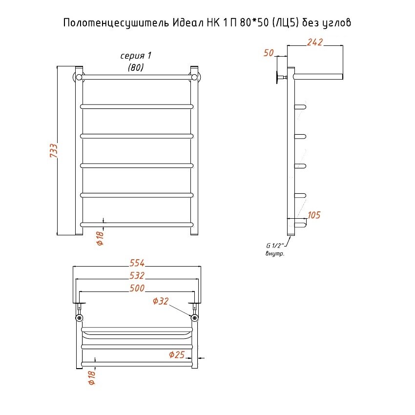 Полотенцесушитель Тругор Идеал НК 1 П 80*50 (ЛЦ5) без углов (Идеал1/НК8050безугл П)