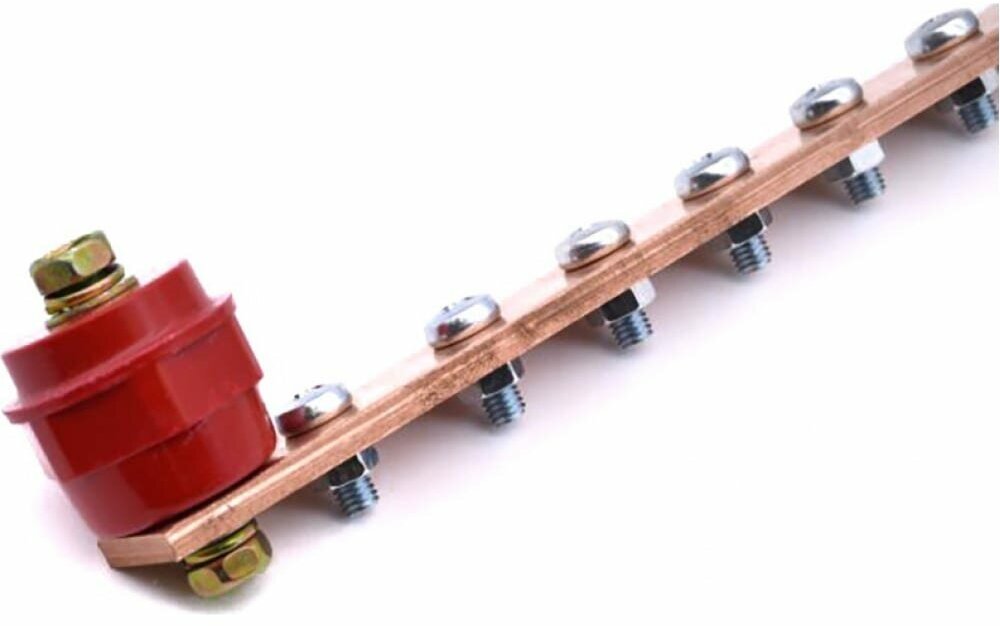 Шина заземления 19" медная с изоляторами и винтами в комплекте. 19 дюймовая эквипотенциальная горизонтальная шина, выполнена из специальной электротехнической меди и соответствует ГОСТ 25861-83.