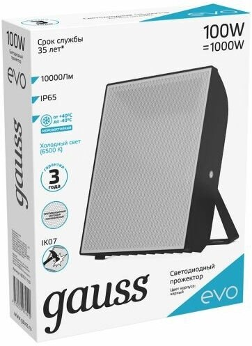 Светодиодные прожекторы Gauss EVO предназначены для освещения фасадов зданий, больших открытых пространств, промышленных объектов, частных загородных домов и спортивных площадок. Прожектор оснащен матовым рассеивателем из светостабилизированного поликарбоната, обеспечивающим равномерную мягкую засветку (угол излучения 110 °). Быстрая и легкая установка на поверхность осуществляется благодаря поворотному изогнутому кронштейну без его демонтажа. Прожектор подходит для замены световых приборов на традиционных галогенных источниках света с целью освещения общественных зон.