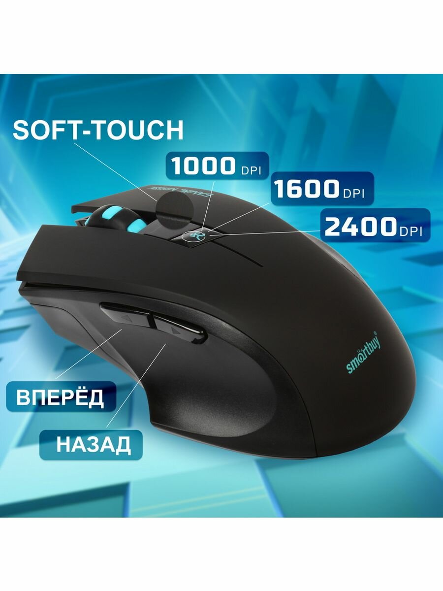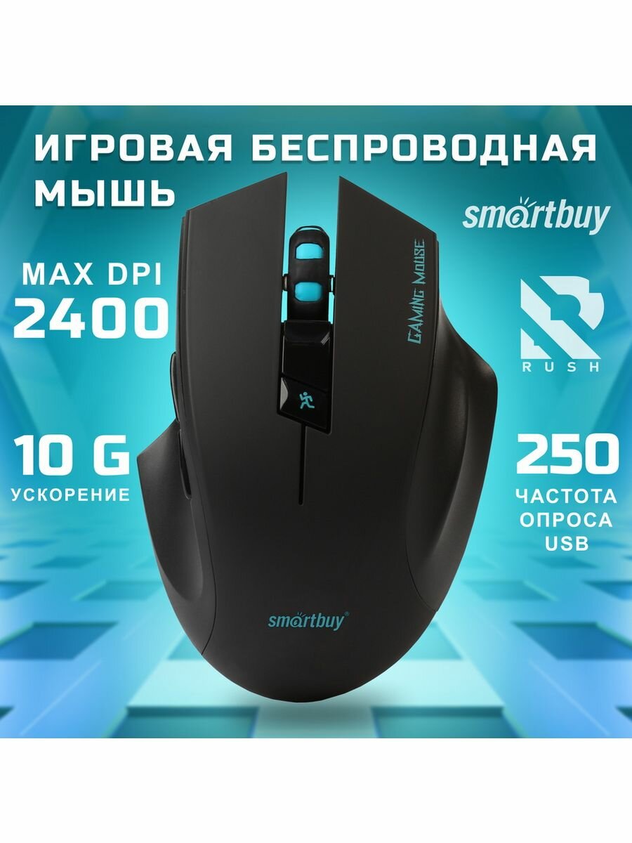 Мышь беспроводная Smartbuy 706 Rush выглядит стильно. В ее оформлении сочетаются классический черный цвет с яркими голубыми элементами. Представленная модель выполнена из пластика с покрытием Soft Touch, приятным на ощупь. Мышка подойдет для правшей. Ее габариты составляют 80x37x113 мм. По своим характеристикам и возможностям эта модель отлично подойдет для игровых баталий. Мышь беспроводная Smartbuy 706 Rush оснащена 6 кнопками. Разрешение оптического светодиодного сенсора можно переключать в режим 1000, 1600 или 2400 dpi. Для переключения разрешения на корпусе предусмотрены дополнительные кнопки. Радиус действия беспроводной связи для этой модели составляет 30 метров. Питание мышки осуществляется от батареек типа AAA, которые прилагаются в комплекте.