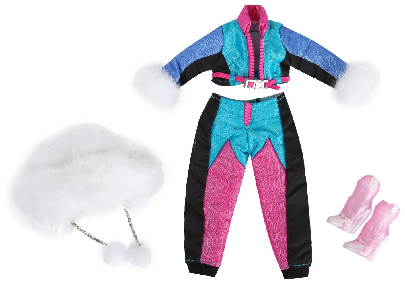 Куколка Icy Gurl с прошитыми пышными волнистыми волосами голубого цвета и голубыми глазами. На ней разноцветный зимний комбинезон и мягкая белая шапка-ушанка. Малышка Brrr B.B. в белой футболке в черный горошек, розовый комбинезон и розовой бейсболке.